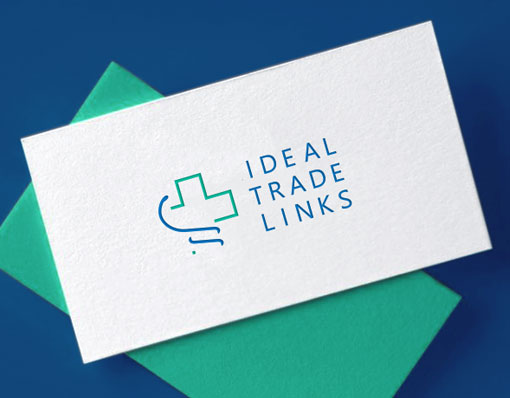 IDEAL TRADE LINKS: logotipo simboliai – į viršų kylanti gyvatėlė ir medicinos kryžiaus ženklas įvardina daugelį farmacijos paslaugų.